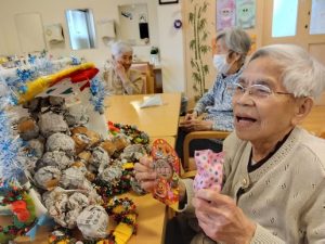 「皆さん、私の為に本日はありがとうございます。」とお礼の言葉を述べられ、誕生日会終了後、襷とメガネを夕食が終わるまで外されず、とても喜んでいただきうれしい限りです。今年も残りわずかとなりましたが、入居者様は体調を崩されることなく、元気に過ごされています。来年も楽しい1年になりますように。