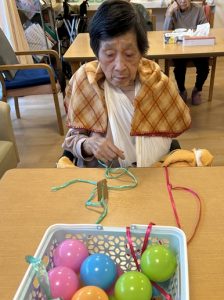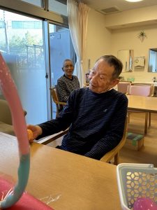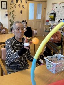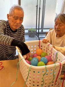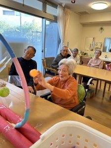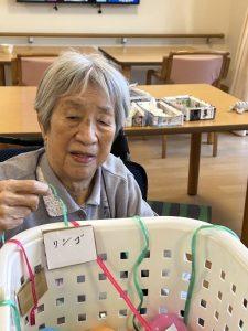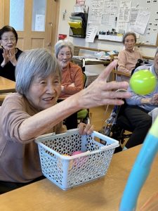 今月の目玉レクは、施設内で行った『フルーツ狩り』です。箱の中にはカラフルなボールと、果物の名前が書かれたカードが入っており、「どれが当たるかな?」「私はリンゴだ!」と皆さまワクワクしながら参加されていました。