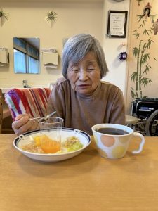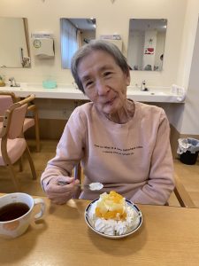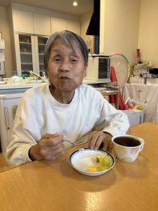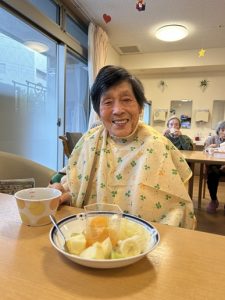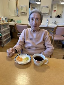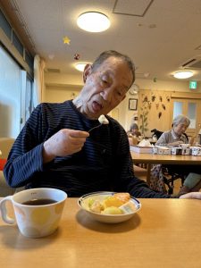 最後は、みかん・マスカット・梨・洋梨・キウイなど、旬のフルーツを盛り合わせた“フルーツプレート”をみんなでいただきました。「甘いねぇ。」「おいしいわ。」「これ好き!」と嬉しそうに召し上がられ、自然に笑顔が広がっていました。手を添えながら「おいしいね。」と表情をほころばせる方、フォークを持つ手が止まらない方など、とても和やかな時間となりました。