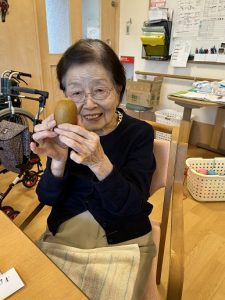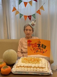 今月は、お一人の利用者様がお誕生日を迎えられました。バースデーハットをかぶり記念撮影をすると、少し照れながらも優しい笑顔を見せてくださいました。職員手作りのフルーツケーキをお出しすると、「わぁ、きれいね。」「美味しいわ〜。」と喜ばれ、ゆっくりと味わっておられました。