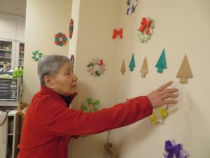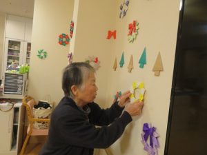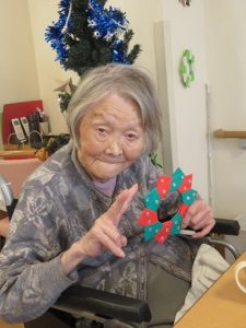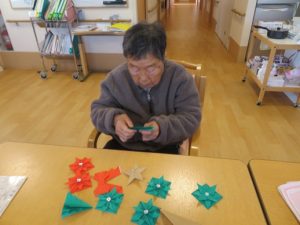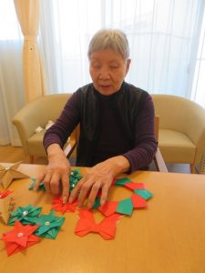 折り紙でクリスマスリースを作りビーズを貼り付け、「ダイヤモンドが付いてるわ~」とにっこり。