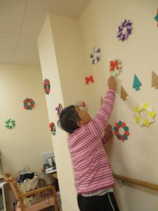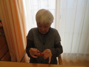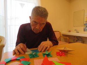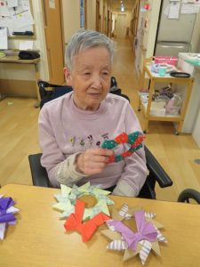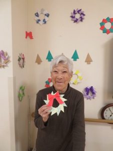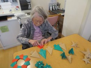 折り紙でクリスマスリースを作りビーズを貼り付け、「ダイヤモンドが付いてるわ~」とにっこり。