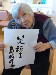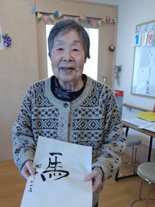 皆様の笑顔とともに、新しい年がスタートいたしました。年明け最初の行事として書き初めを行い、少しお手伝いをさせていただきながら、「笑」「馬」「笑福」など、個性あふれる素敵な作品が並びました。