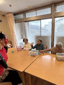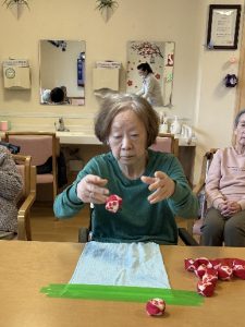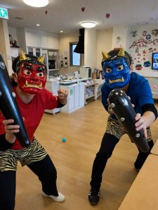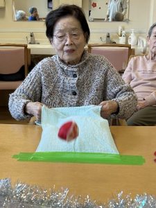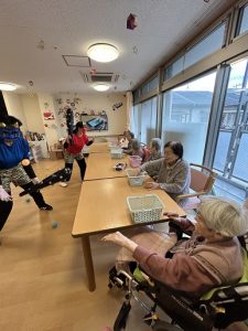 節分では、職員が鬼に変身して登場、「鬼は外、福は内!」の掛け声とともに、ボールを使った豆まきを楽しまれました。皆様の真剣な表情や笑顔が見られ、フロアは明るい雰囲気に包まれました。