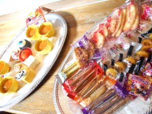 テーブルには、プチケーキや柿のピューレ、懐かしい袋菓子など、季節を感じるお菓子がずらりと並びました。