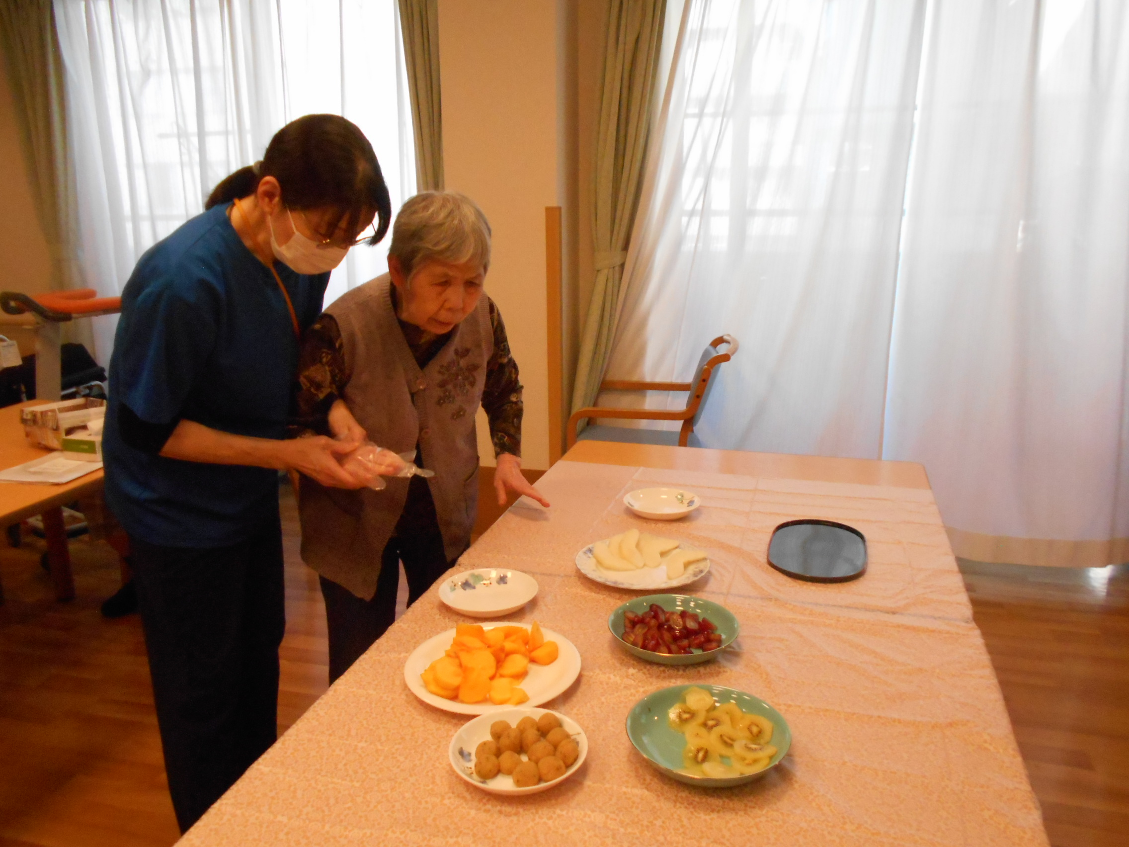 色りどりに盛り付けられたフルーツを前に、「どれから食べようかな」と笑顔がこぼれ、食欲の秋にぴったりのひとときとなりました。
