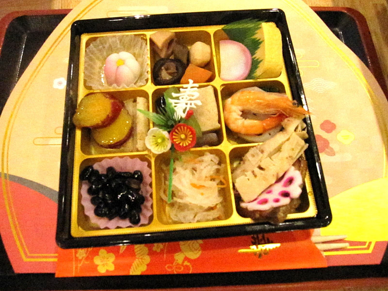 黒豆、サツマイモの甘煮、厚焼き玉子とかまぼこ、筑前煮、紅白生酢、エビ、生菓子など、