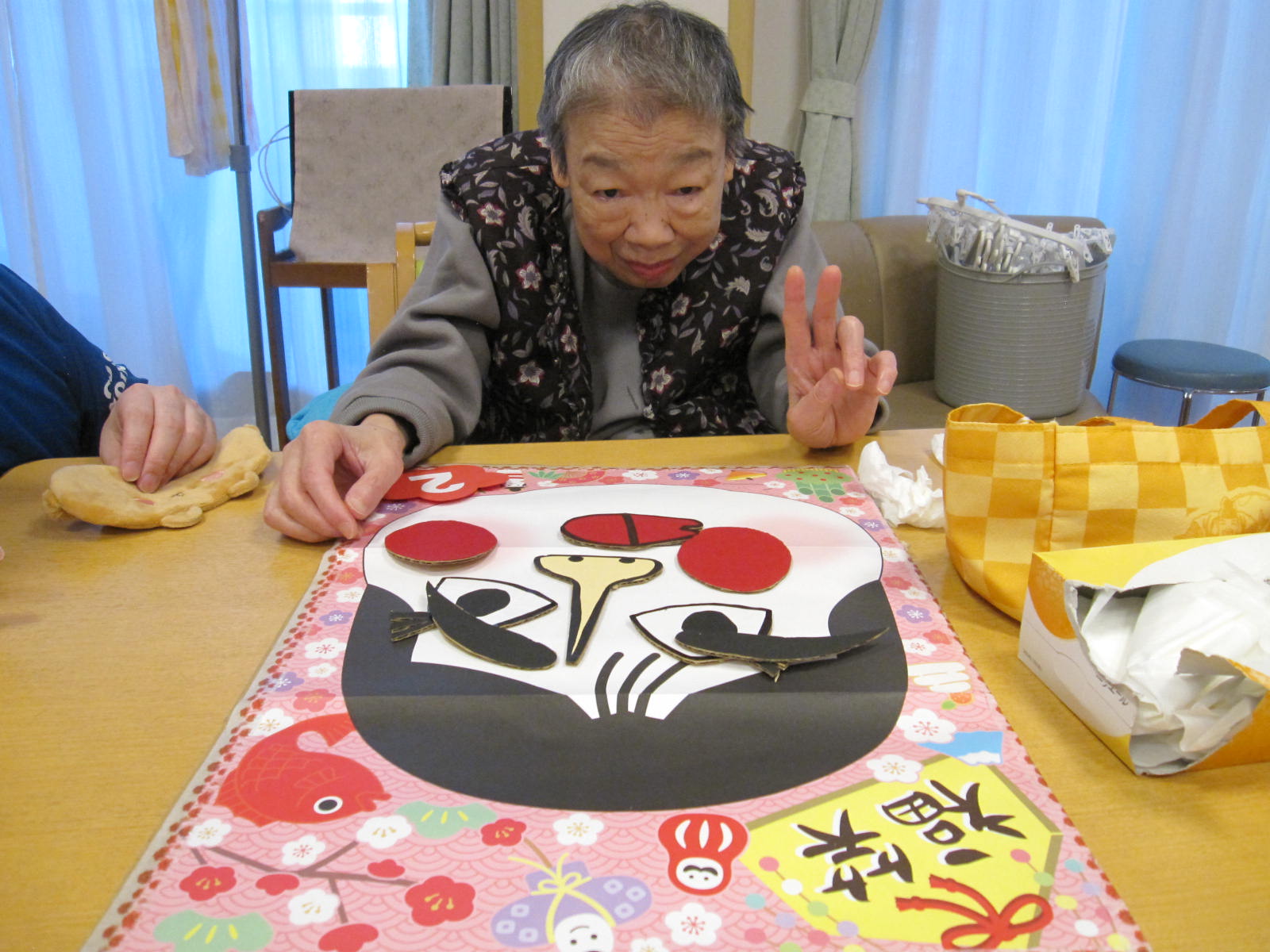 続いては、思わず笑顔になるお正月遊び、福笑い を楽しみました。