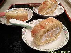 節分のおやつは、恵方巻にちなんで“巻き”をイメージしたイチゴソースのロールケーキをご用意しました。