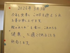 最後に職員より、今年もこうして皆様と一緒にひな祭りをお祝いできたことへの感謝と、これからも健康で穏やかに過ごしていただきたいという願いをお伝えしました。
