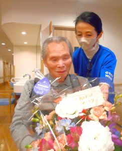 お祝いを受けられたご入居者様も、少し照れながらも嬉しそうなご様子で、周囲の皆様も一緒に喜ばれている姿がとても印象的でした。