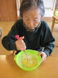 ガトーショコラ作りにもチャレンジしました。卵を割って生地を混ぜてもらい、仕上げに粉糖をパラパラ~(^o^)丿「美味しいね」「豪華なねぇ」と好評でしたよ。