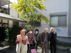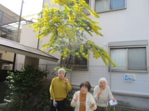 施設の正面玄関出たところで立派なミモザが